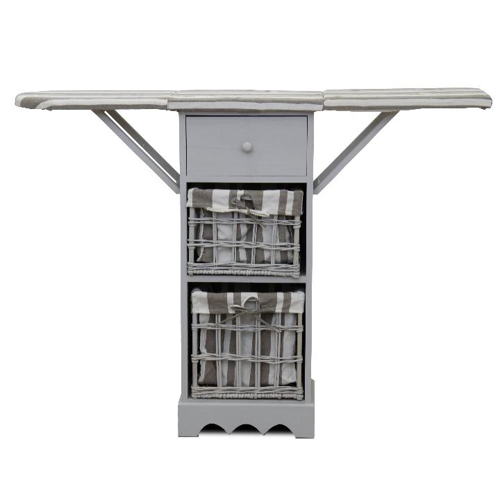 1) Összecsukható vasalódeszka tömörfa vázzal, anyag:fa+vesszők, színváltozatok: szürke vagy sötétbarna, ELI és AYA szériával kombinálható, Szé/Ma/Mé:118x86x30 cm.