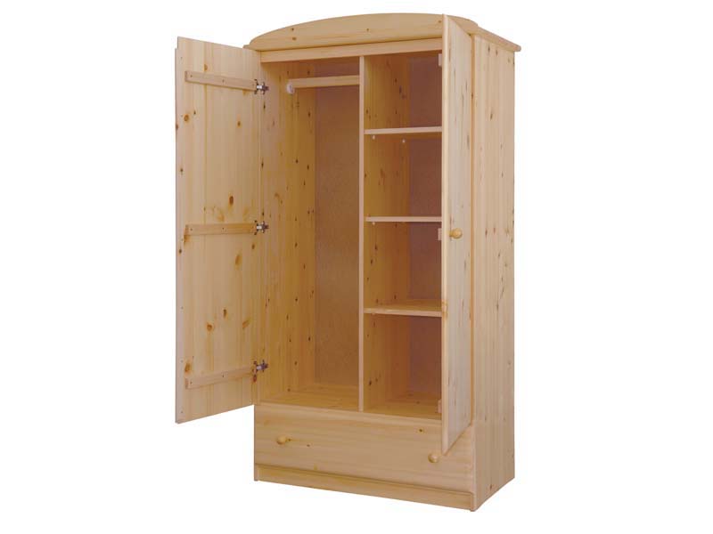 Akasztós és polcos belső elrendezéssel készülő, kifejezetten masszív fenyő szekrény. A termék felső peremléccel és díszléccel rendelkezik, lábazata szoklis kivitelű.