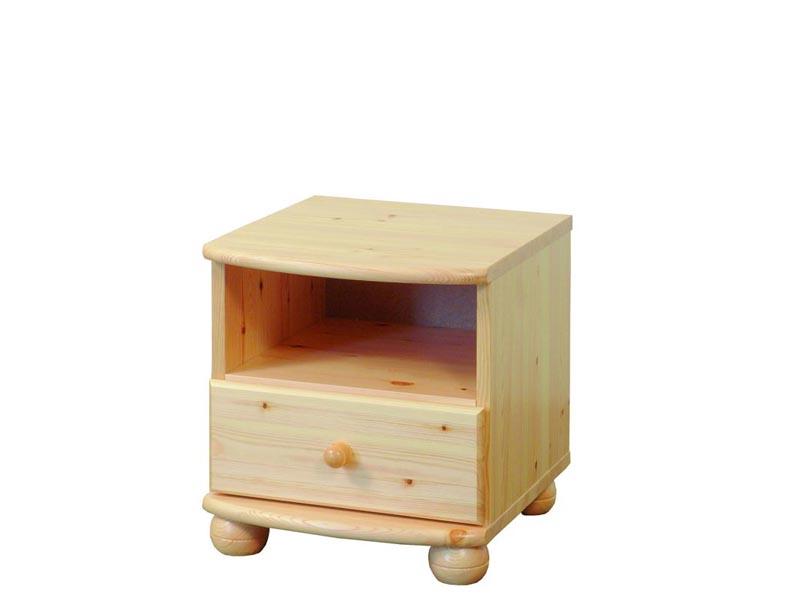 Klasszikus kivitelezésű és megjelenésű borovi fenyő éjjeliszekrény, mely elegáns pogácsa lábakon áll.