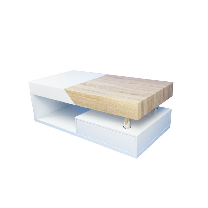 Dohányzóasztal MELIDA Színes kivitelben: fehér HG/ tölgy sonoma Anyag: MDF/fém Méretek(SzéxMéxMa): 120x60x43 cm Lapszerelten csomagolva.