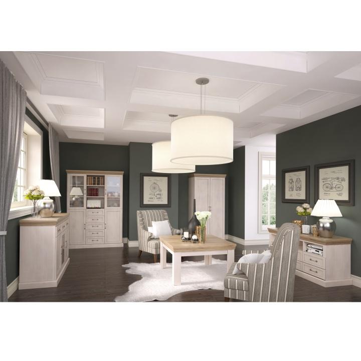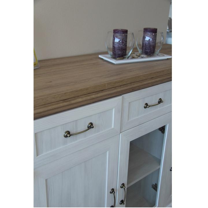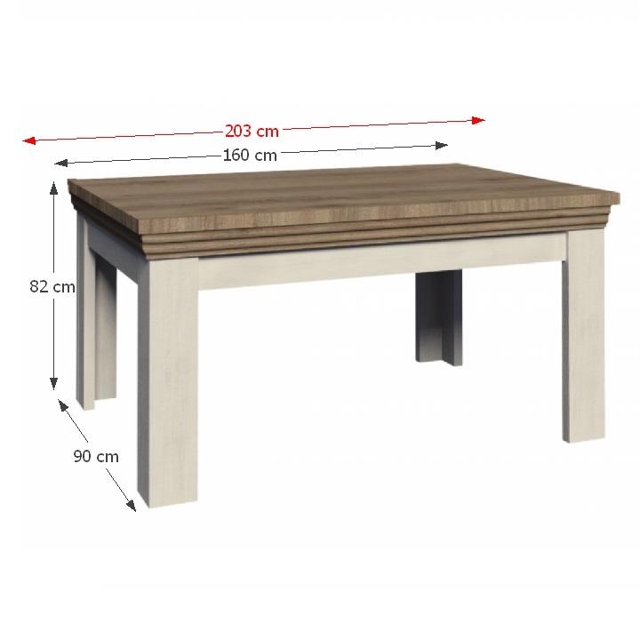 Étkezőasztal - széthúzható, elegáns provence-i stílusban, a ROYAL bútorcsaládból Felépítheti álmai ebédlőjét a saját elképzelése szerint. Az asztal összecsukva 160 cm, kihúzva 203 cm széles. Anyag: laminált DTD + dekoratív élek, fém rögzítők Színváltozat: fehér északi lucfenyő /vad tölgy kombinációban Méretek (SzéxMaxMé): 160-203x82x90 cm Lapraszerelten szállítva