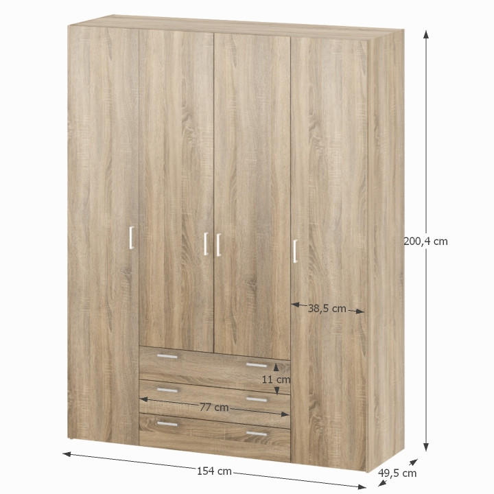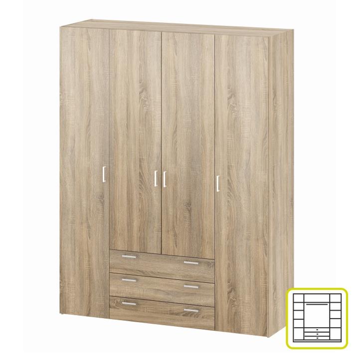 4 ajtós szekrény akasztórúddal és polccal, oldalsó szekrények polcosak, 3 fiók, GWEN 70429 Színe: sonoma tölgy Anyag: fóliázott DTD Méretek (SzéxMéxMa): 154,8x49,5x200,4 cm Anyag vastagsága: 12 mm Szállítás szétszerelve