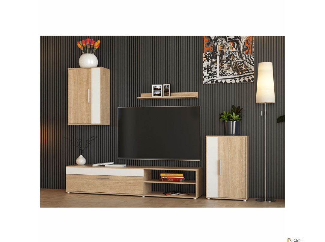 Egy nappali szekrénysor, amely meleg és barátságos légkört teremt otthonában - ez az ASOLE NEW. Gyönyörű stílusával, egyszerűségével és maximális kihasználhatóságával tűnik ki. Az ASOLE NEW nemcsak dekoratív funkciót tölt be, hanem mindenekelőtt funkcionális, amit a valóban sokoldalú tárhelye is bizonyít. A laminált forgácslapnak, valamint a sonoma tölgy és fehér színváltozatnak köszönhetően magabiztos hatást kelt. A fa dekor és a fehér szín kombinációja egyszerűen ellenállhatatlan és beragyogja a belső teret. A nappali fal két szekrényből, egy TV asztalból és polcból áll. A fali szekrény és a komód tárhelyét egy polc osztja két részre. A TV asztal felülről nyitható szekrénnyel rendelkezik, amely belül választófallal van két tárolóhelyre osztva. A TV asztal oldalán egy nyitott tér található, amely polccal van két részre osztva. A polc dekorációs elem, ugyanakkor helyet biztosít majd a könyvek vagy a fotók számára.